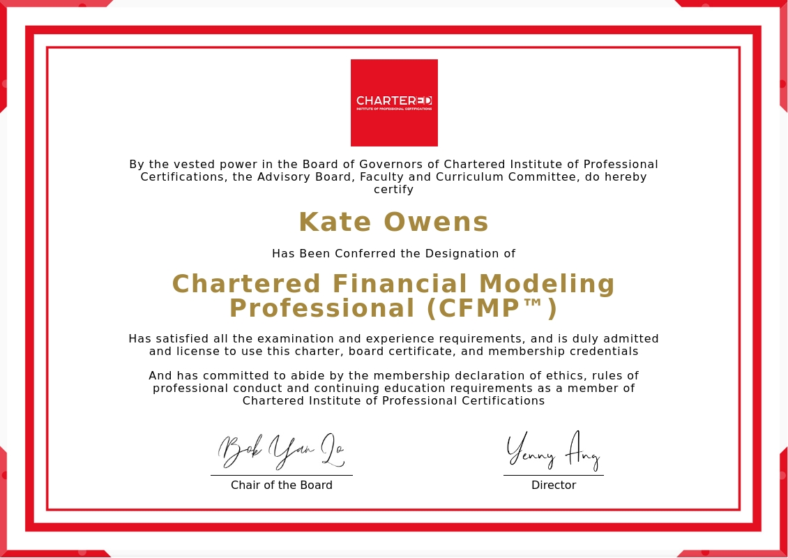 The certificate above verifies that Bok Yan Lo successfully satisfied all the exam and experience requirements and is duly admitted and licensed to use this Charter Chartered Financial Modeling Professional (CFMP™), board certificate.