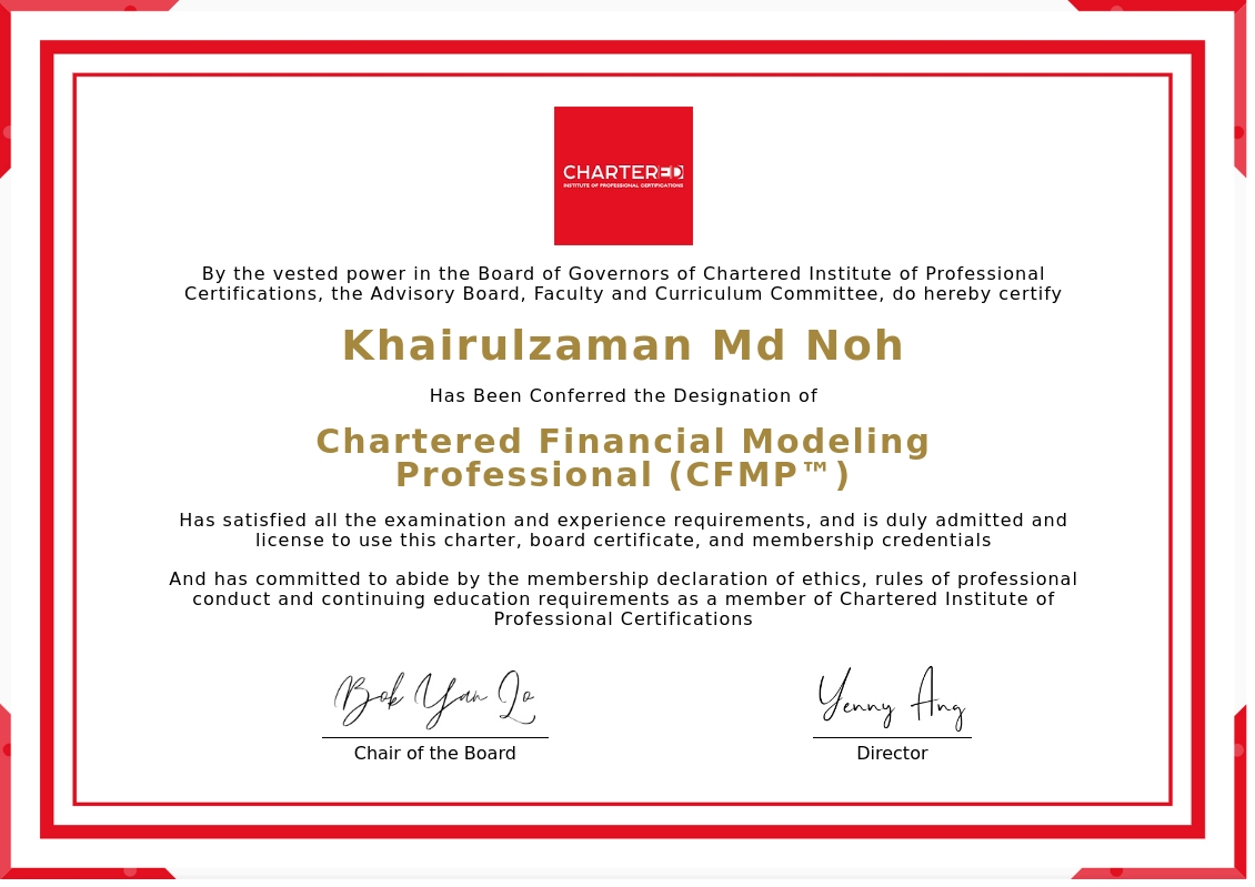 The certificate above verifies that Khairulzaman Md Noh successfully satisfied all the exam and experience requirements and is duly admitted and licensed to use this Charter Chartered Financial Modeling Professional (CFMP™), board certificate.