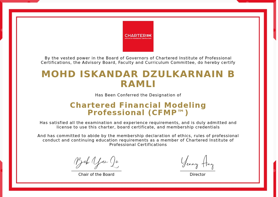 The certificate above verifies that MOHD ISKANDAR DZULKARNAIN B RAMLI successfully satisfied all the exam and experience requirements and is duly admitted and licensed to use this Charter Chartered Financial Modeling Professional (CFMP™), board certificate.