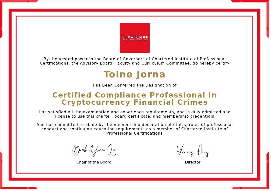 The certificate above verifies that Toine Jorna successfully satisfied all the exam and experience requirements and is duly admitted and licensed to use this Charter Certified Compliance Professional in Cryptocurrency Financial Crimes (CCPC™), board certificate.