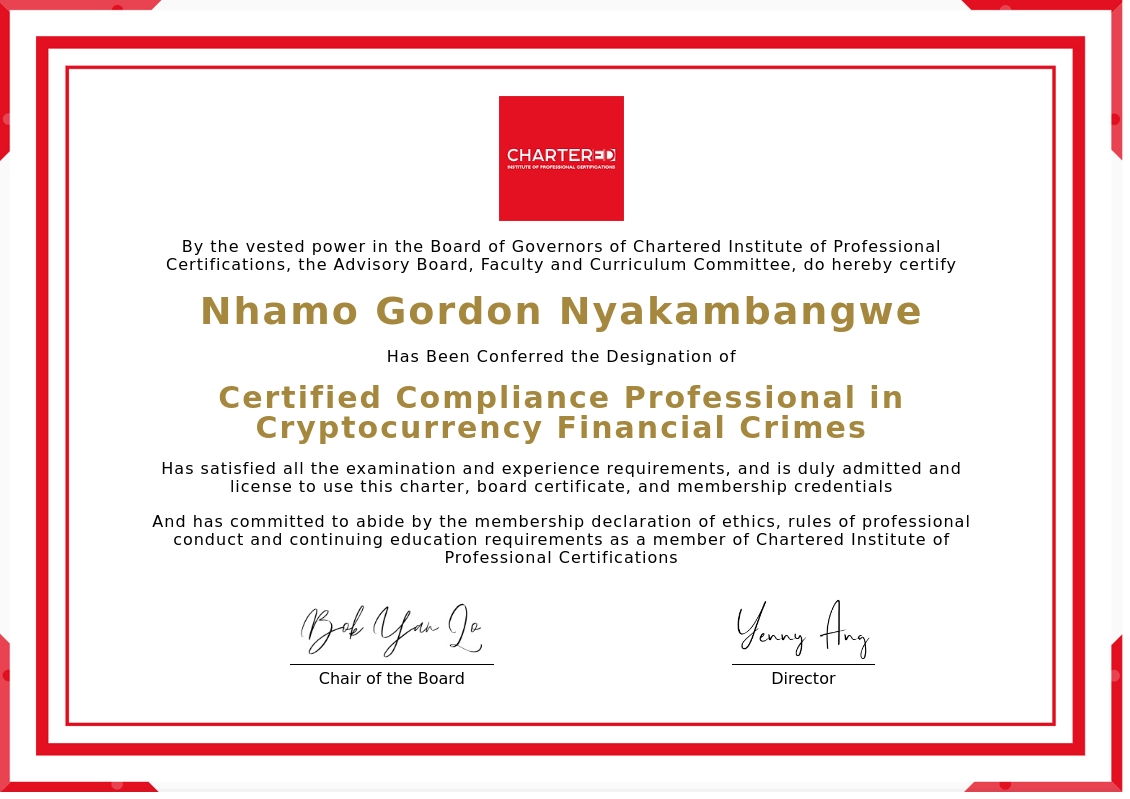 The certificate above verifies that Nhamo Gordon Nyakambangwe successfully satisfied all the exam and experience requirements and is duly admitted and licensed to use this Charter Certified Compliance Professional in Cryptocurrency Financial Crimes (CCPC™), board certificate.