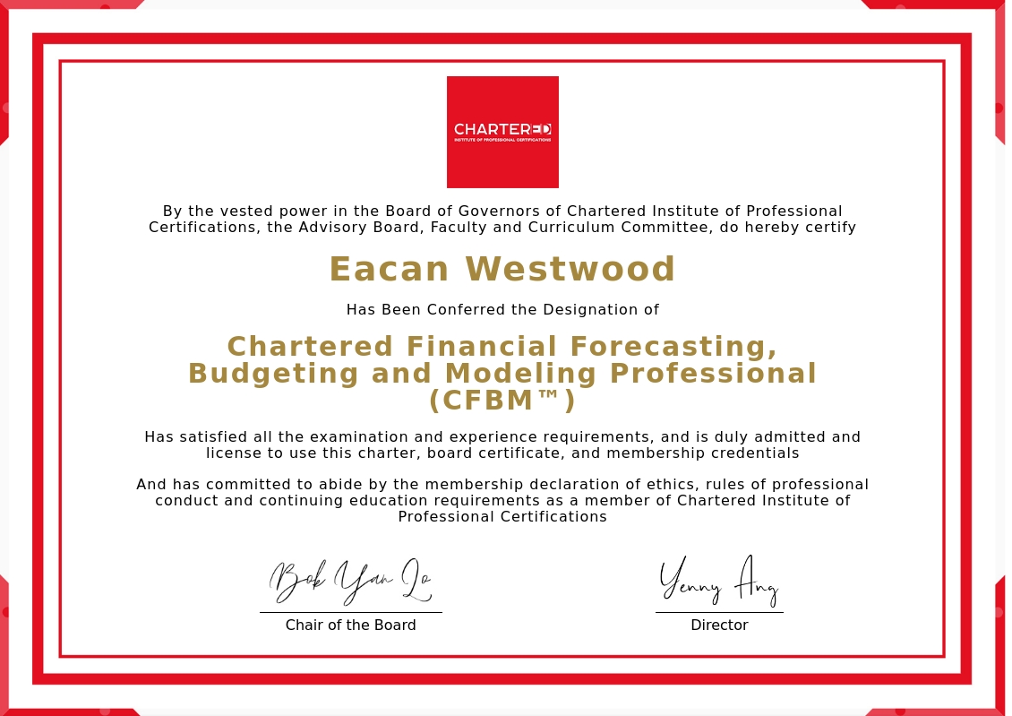 The certificate above verifies that Eacan Westwood successfully satisfied all the exam and experience requirements and is duly admitted and licensed to use this Charter Chartered Financial Forecasting, Budgeting and Modeling Professional (CFBM™), board certificate.