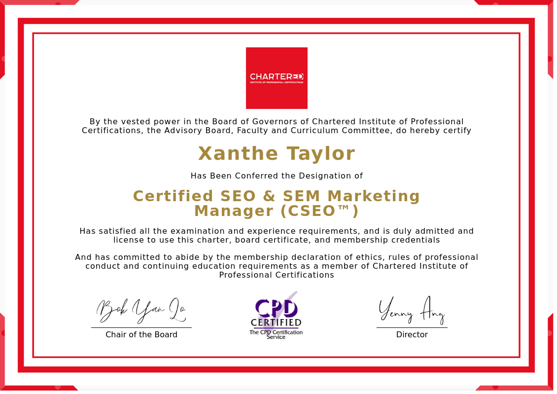 The certificate above verifies that Xanthe Taylor successfully satisfied all the exam and experience requirements and is duly admitted and licensed to use this Charter Certified SEO & SEM Marketing Manager (CSEO™), board certificate.