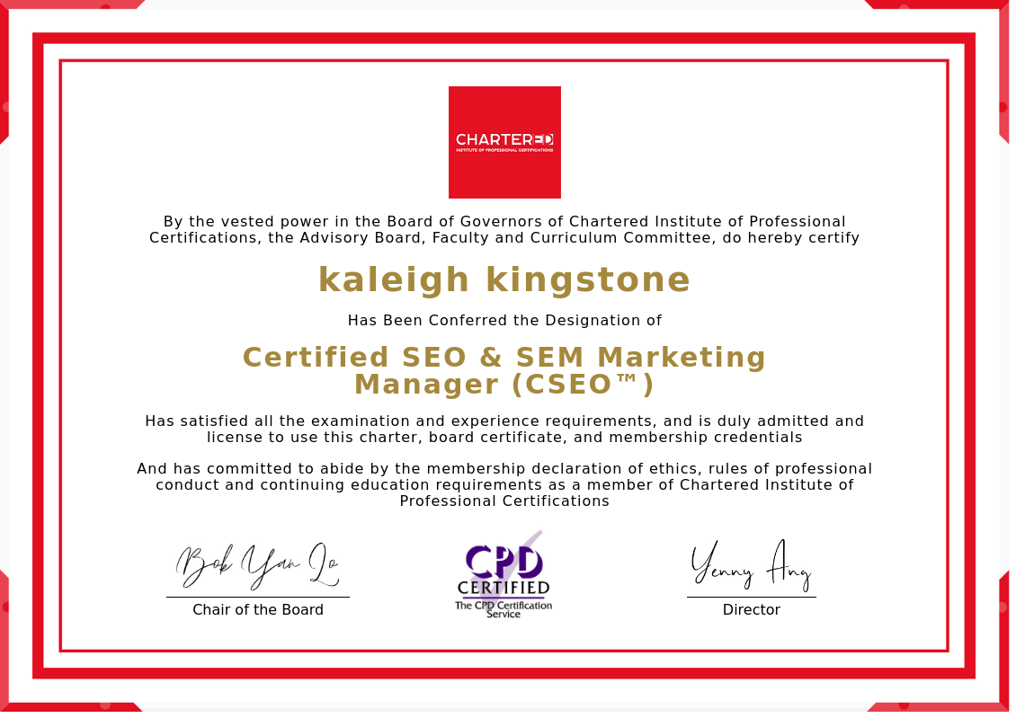 The certificate above verifies that kaleigh kingstone successfully satisfied all the exam and experience requirements and is duly admitted and licensed to use this Charter Certified SEO & SEM Marketing Manager (CSEO™), board certificate.