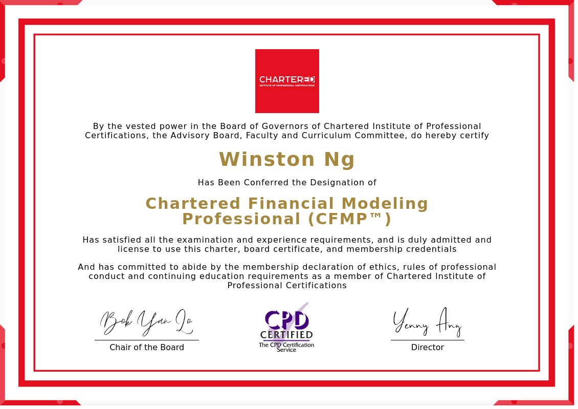 The certificate above verifies that Winston Ng successfully satisfied all the exam and experience requirements and is duly admitted and licensed to use this Charter Chartered Financial Modeling Professional (CFMP™), board certificate.