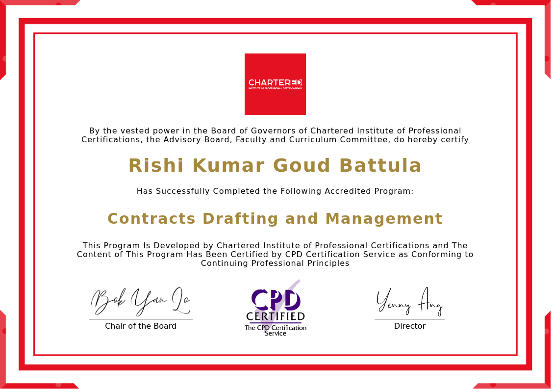 The certificate above verifies that Rishi Kumar Goud Battula successfully completed the accredited program: Drafting Key Commercial Contracts and Reviewing Crucial Terms and Conditions For Non-Lawyers.