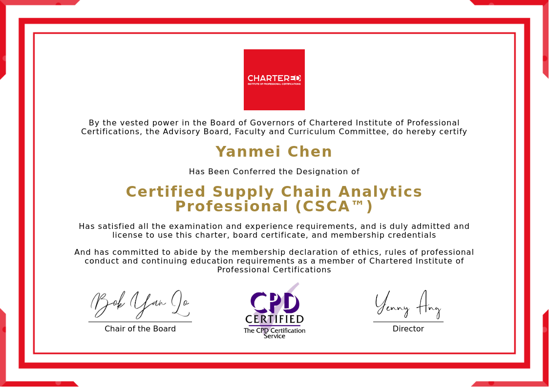 The certificate above verifies that Yanmei Chen successfully satisfied all the exam and experience requirements and is duly admitted and licensed to use this Charter Certified Supply Chain Analytics Professional (CSCA™), board certificate.