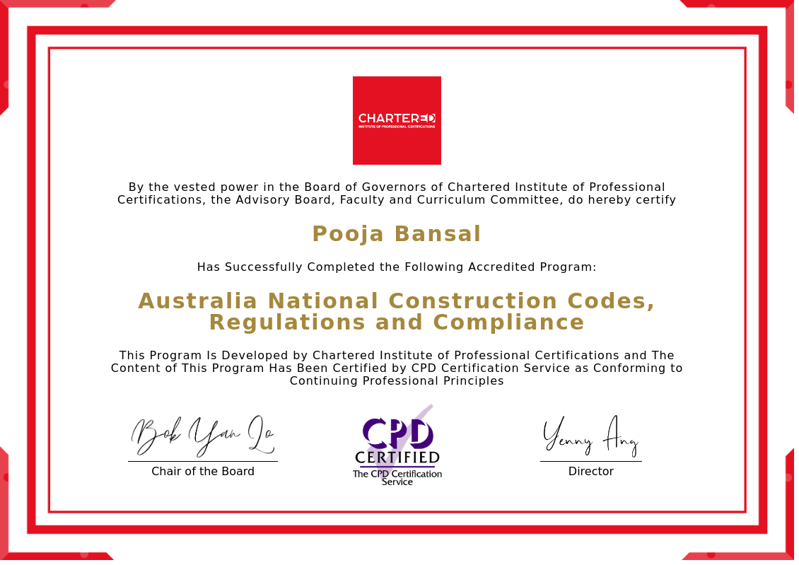 The certificate above verifies that Pooja Bansal successfully completed the accredited program: Australia National Construction Codes, Regulations and Compliance.
