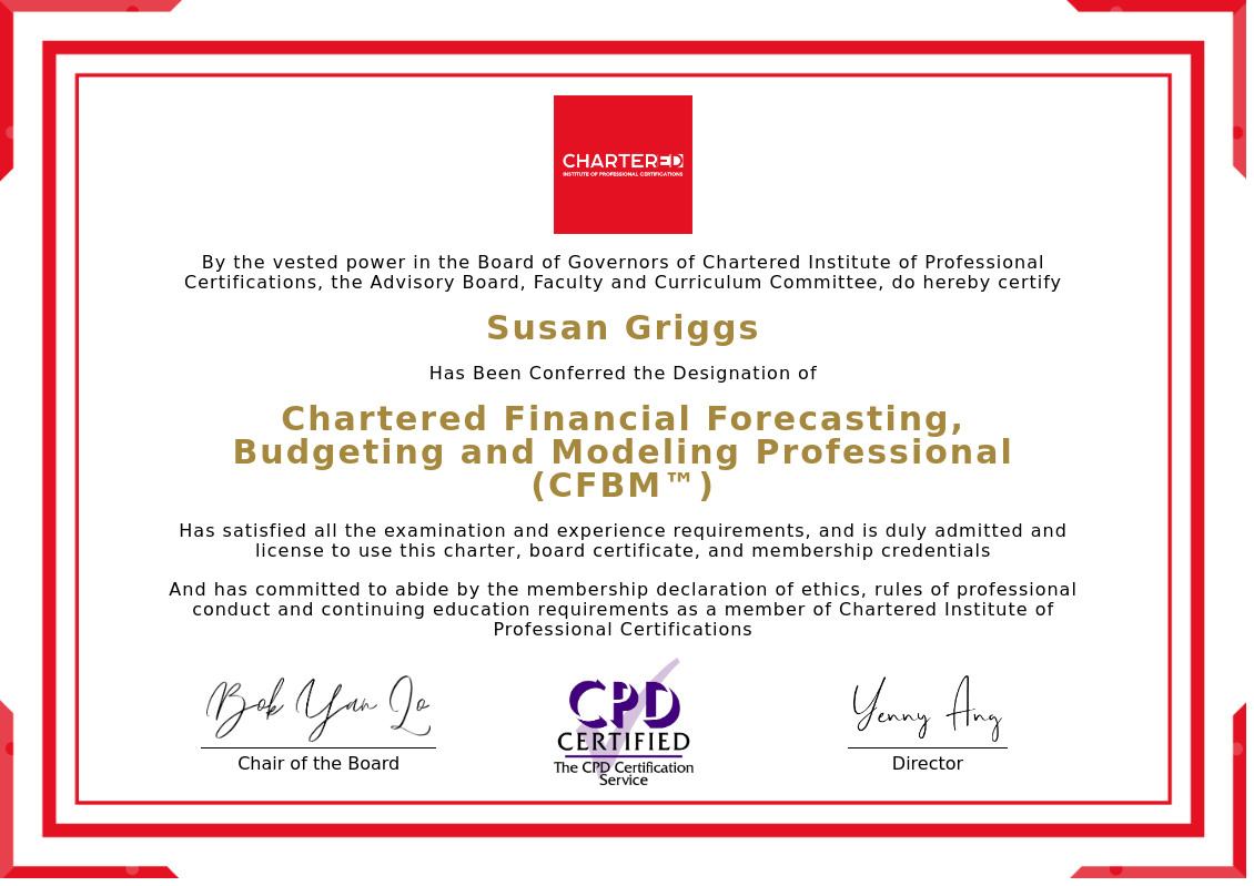 The certificate above verifies that Susan Griggs successfully satisfied all the exam and experience requirements and is duly admitted and licensed to use this Charter Chartered Financial Forecasting, Budgeting and Modeling Professional (CFBM™), board certificate.