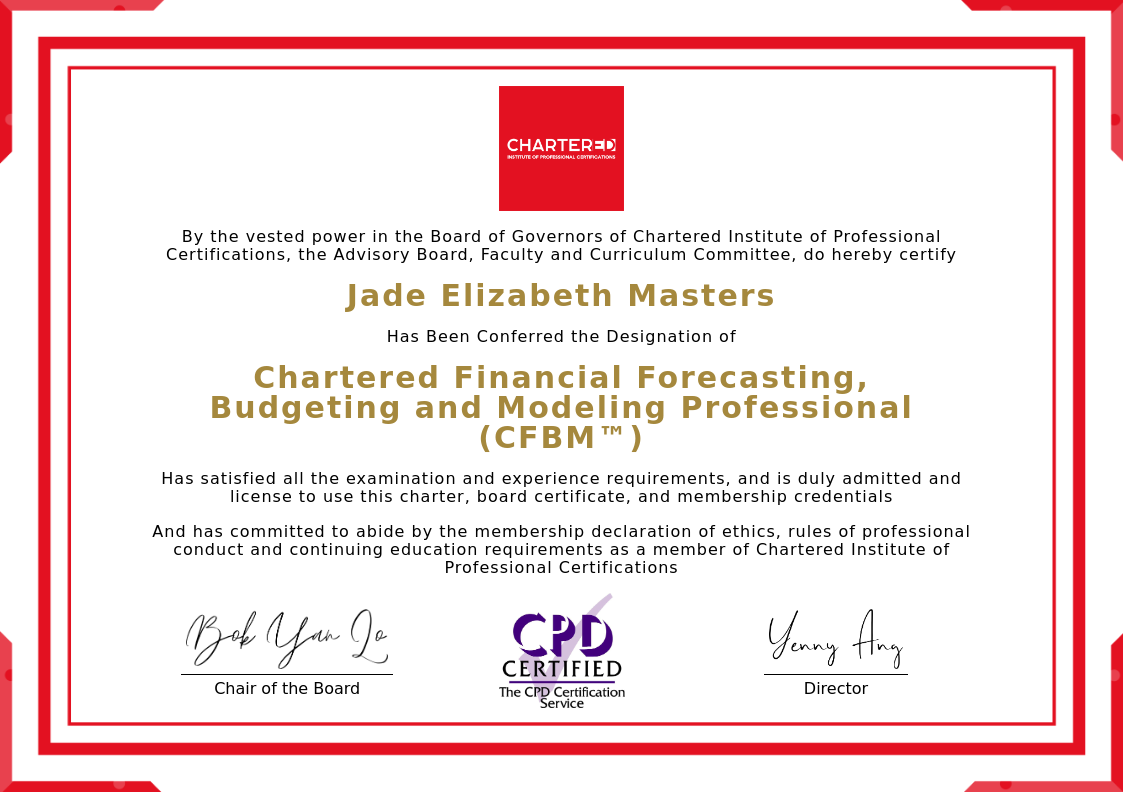 The certificate above verifies that Jade Elizabeth Masters successfully satisfied all the exam and experience requirements and is duly admitted and licensed to use this Charter Chartered Financial Forecasting, Budgeting and Modeling Professional (CFBM™), board certificate.