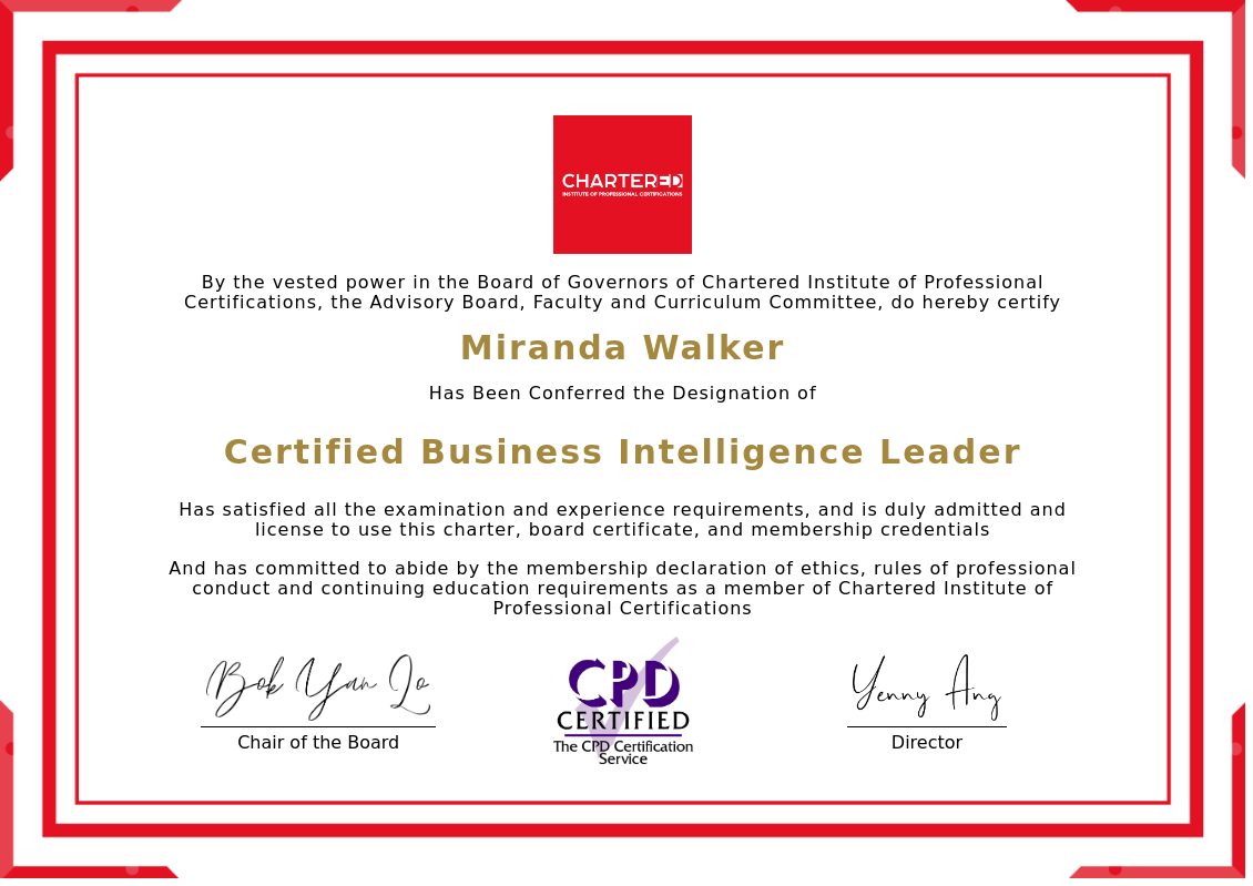 The certificate above verifies that Miranda Walker successfully satisfied all the exam and experience requirements and is duly admitted and licensed to use this Charter Certified Business Intelligence Leader (CBIL™), board certificate.