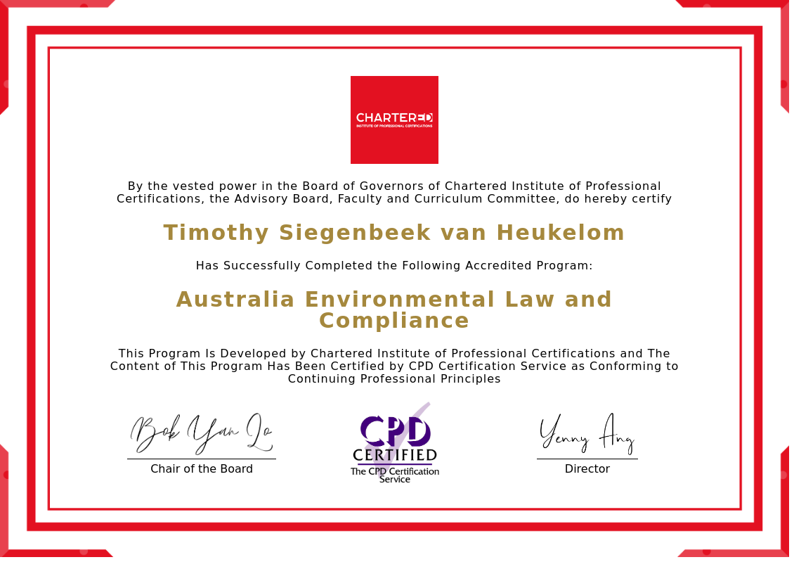 The certificate above verifies that Timothy Siegenbeek van Heukelom successfully completed the accredited program: Australia Environmental Law and Compliance.