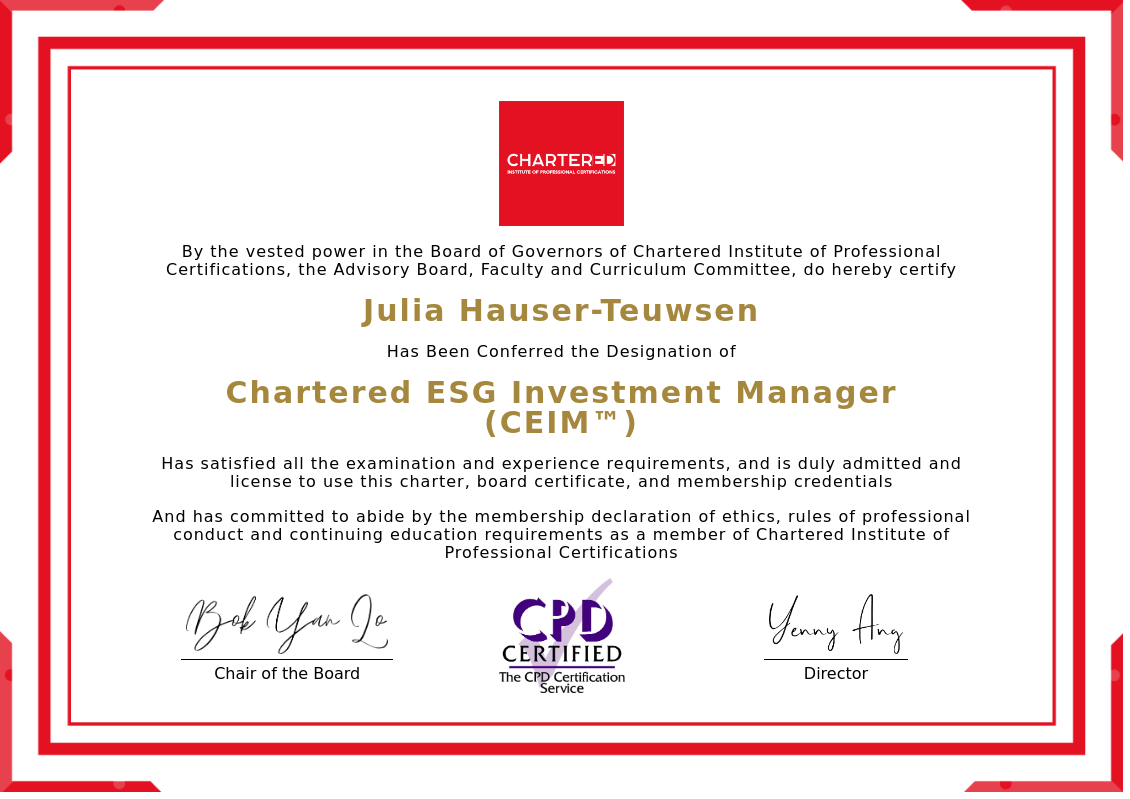The certificate above verifies that Julia Hauser-Teuwsen successfully satisfied all the exam and experience requirements and is duly admitted and licensed to use this Charter Chartered ESG Investment Manager (CEIM™), board certificate.