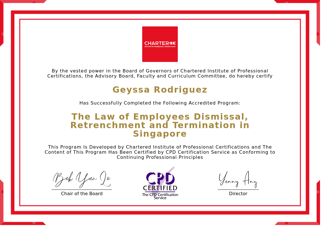 The certificate above verifies that Geyssa Rodriguez successfully completed the accredited program: The Law of Employees Dismissal, Retrenchment and Termination in Singapore.
