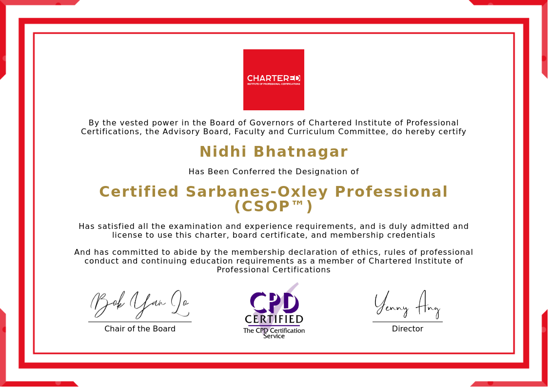 The certificate above verifies that Nidhi Bhatnagar successfully satisfied all the exam and experience requirements and is duly admitted and licensed to use this Charter Certified Sarbanes-Oxley Professional (CSOP™), board certificate.