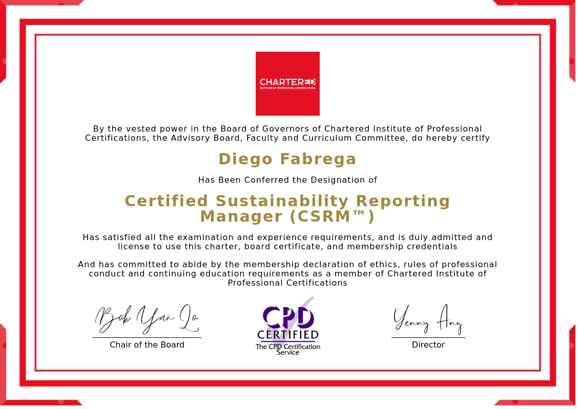 The certificate above verifies that Diego Fabrega successfully satisfied all the exam and experience requirements and is duly admitted and licensed to use this Charter Certified Sustainability Reporting Manager (CSRM™), board certificate.