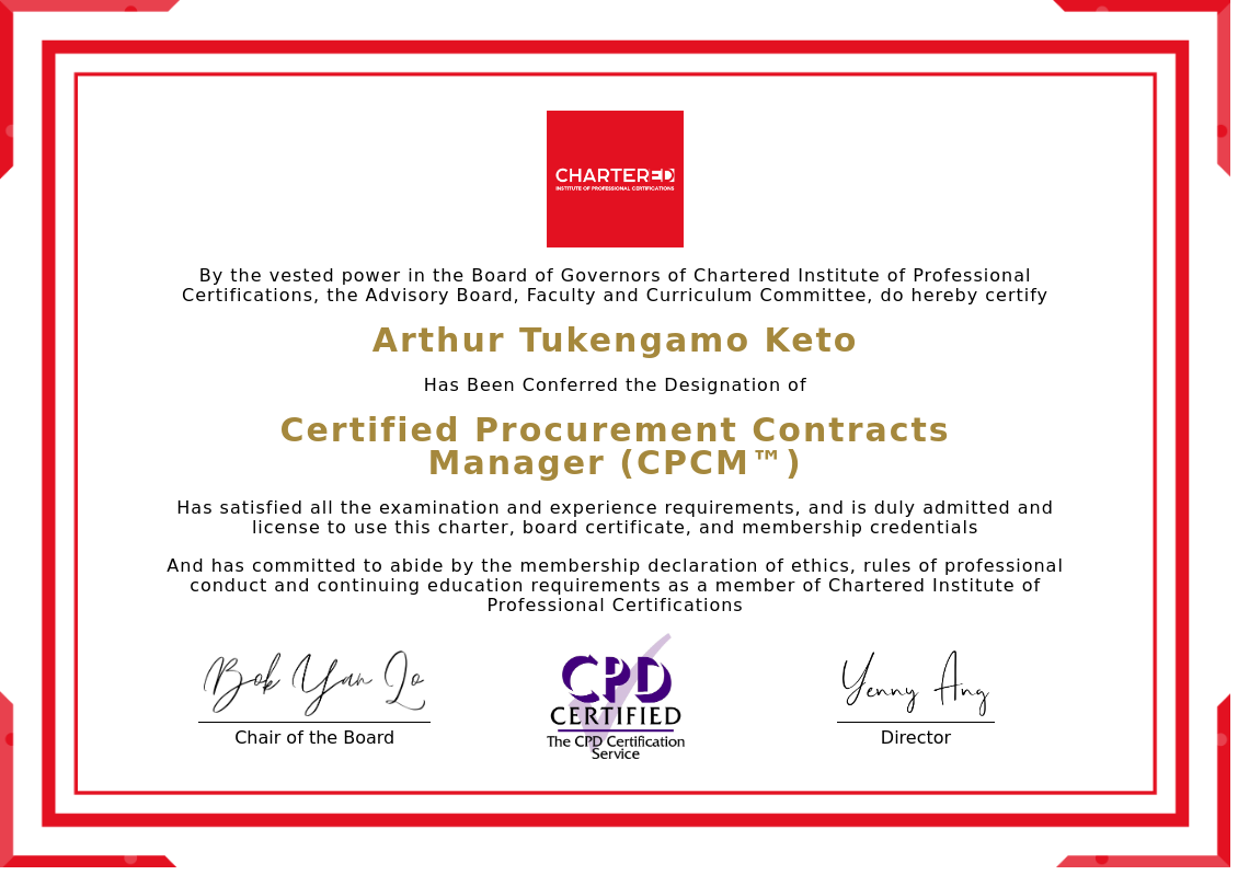 The certificate above verifies that ARTHUR TUKENGAMO KETO successfully satisfied all the exam and experience requirements and is duly admitted and licensed to use this Charter Certified Procurement Contracts Manager (CPCM™), board certificate.