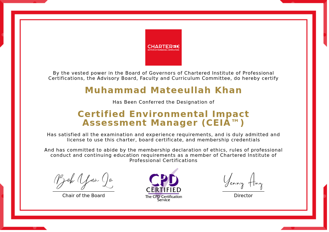The certificate above verifies that Muhammad Mateeullah Khan successfully satisfied all the exam and experience requirements and is duly admitted and licensed to use this Charter Certified Environmental Impact Assessment Manager (CEIA™), board certificate.