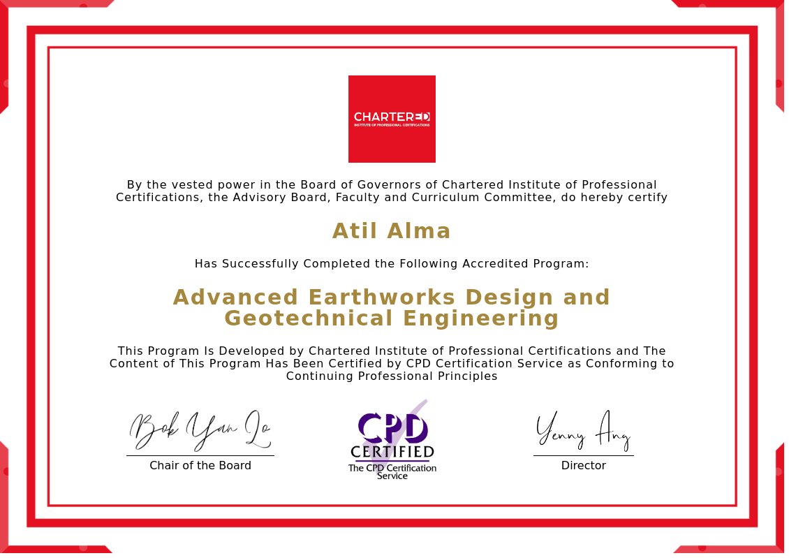 The certificate above verifies that Atil Alma successfully completed the accredited program: Advanced Earthworks Design and Geotechnical Engineering.