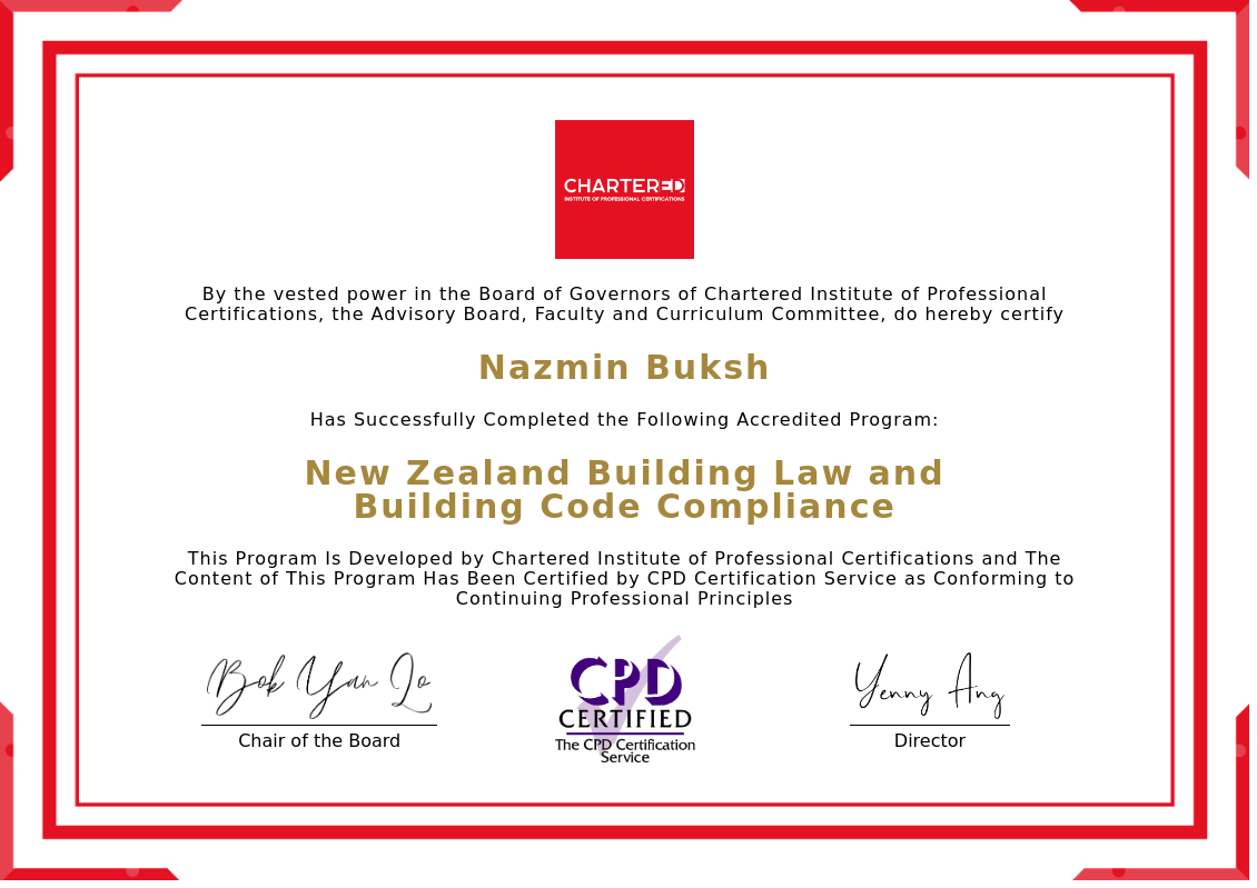 The certificate above verifies that Nazmin Buksh successfully completed the accredited program: New Zealand Building Law and Building Code Compliance.