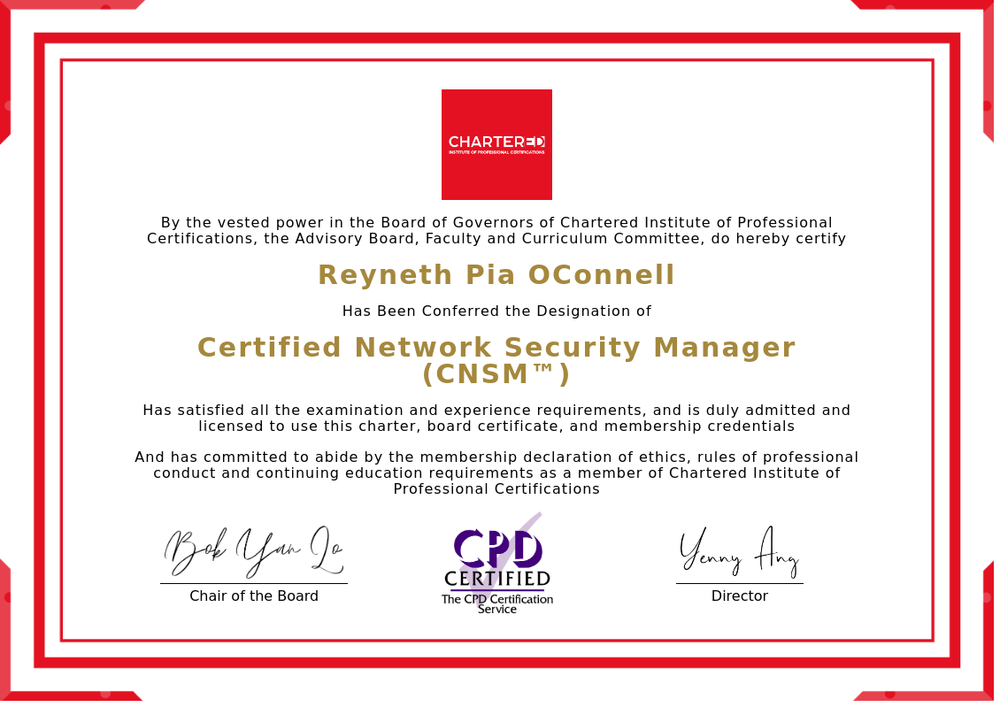 The certificate above verifies that Reyneth Pia OConnell successfully satisfied all the exam and experience requirements and is duly admitted and licensed to use this Charter Certified Network Security Manager (CNSM™), board certificate.