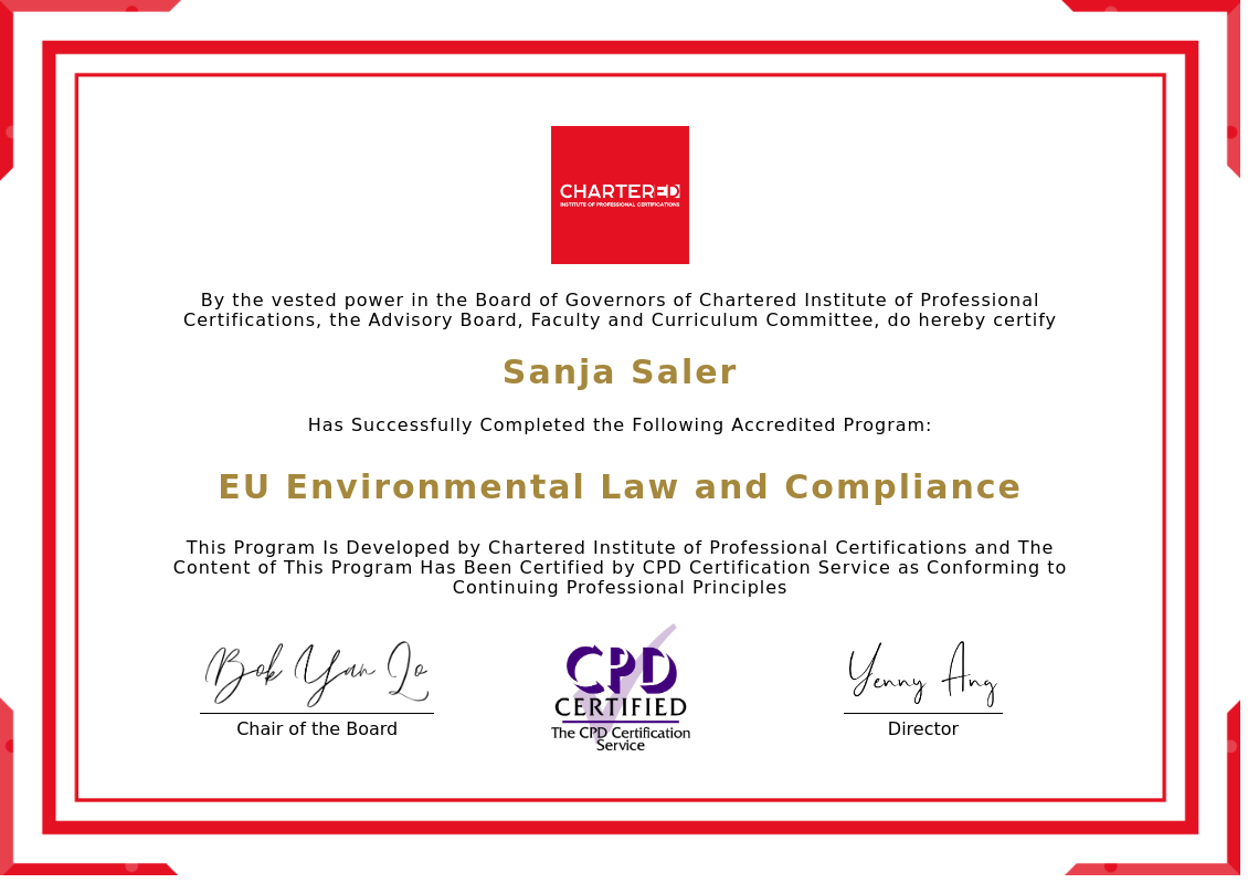 The certificate above verifies that Sanja Saler successfully completed the accredited program: EU Environmental Law and Compliance.