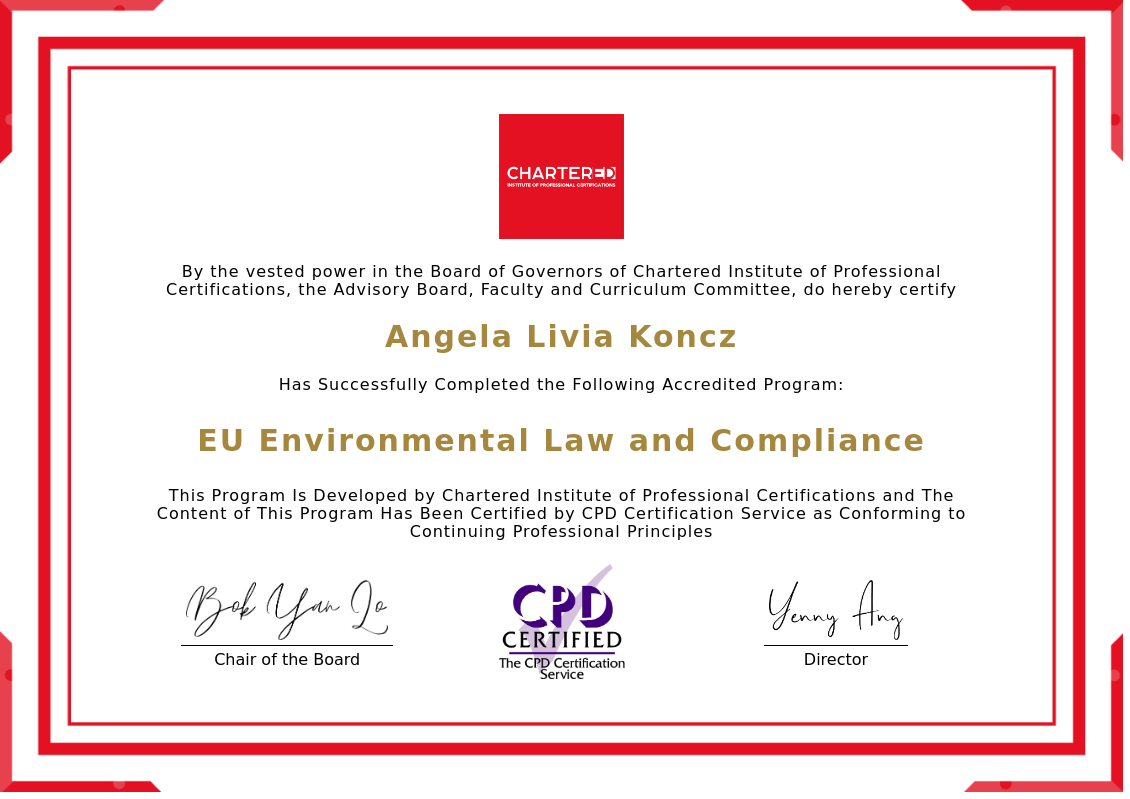 The certificate above verifies that Angela Livia Koncz successfully completed the accredited program: EU Environmental Law and Compliance.