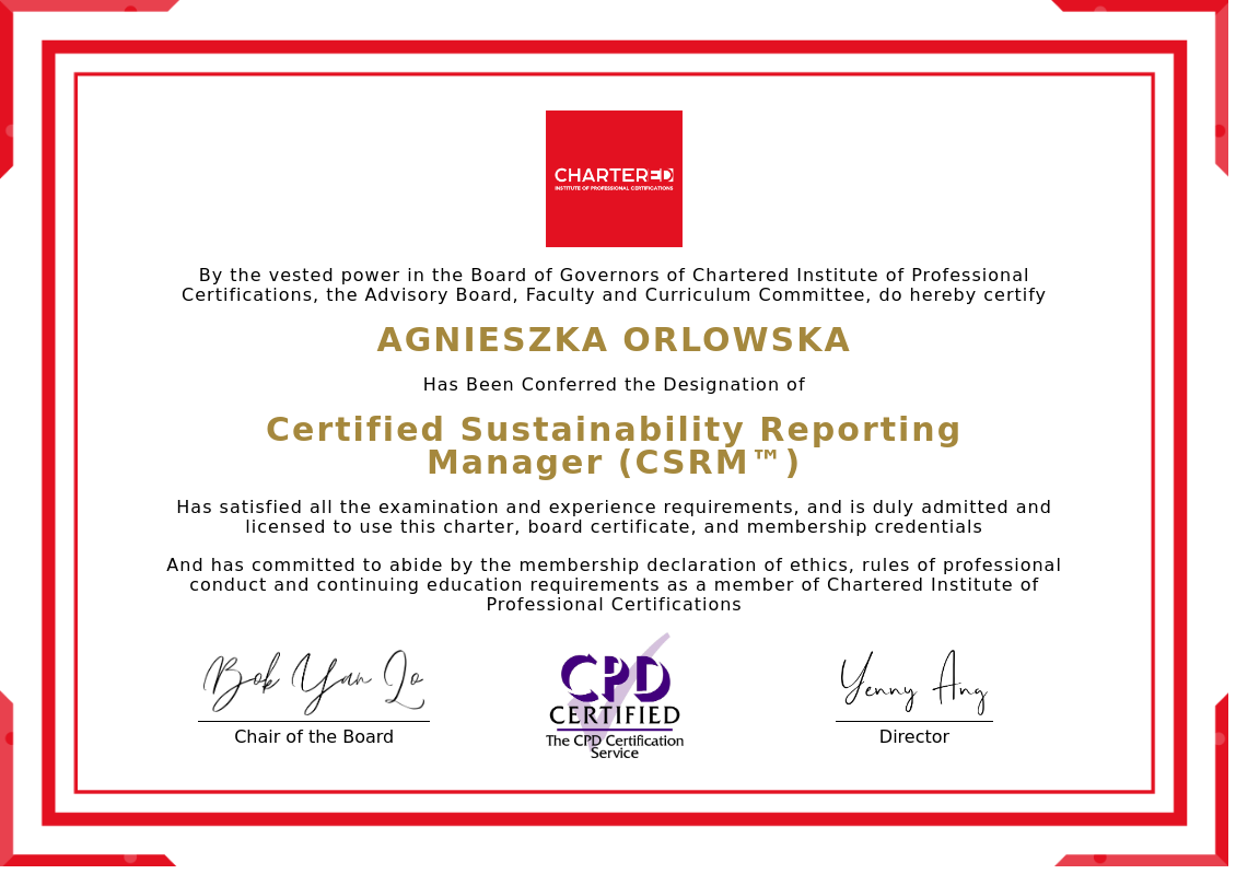 The certificate above verifies that AGNIESZKA ORLOWSKA successfully satisfied all the exam and experience requirements and is duly admitted and licensed to use this Charter Certified Sustainability Reporting Manager (CSRM™), board certificate.