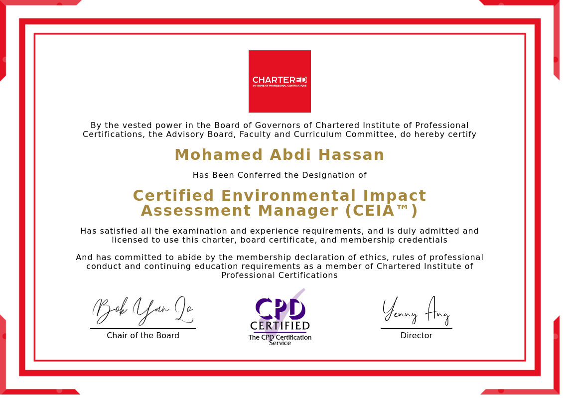 The certificate above verifies that Mohamed Abdi Hassan successfully satisfied all the exam and experience requirements and is duly admitted and licensed to use this Charter Certified Environmental Impact Assessment Manager (CEIA™), board certificate.
