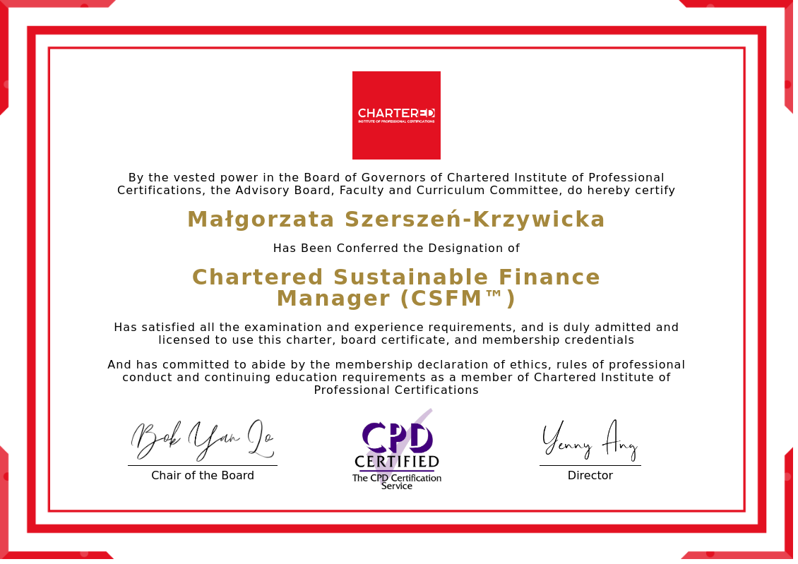 The certificate above verifies that Małgorzata Szerszeń-Krzywicka successfully satisfied all the exam and experience requirements and is duly admitted and licensed to use this Charter Chartered Sustainable Finance Manager (CSFM™), board certificate.