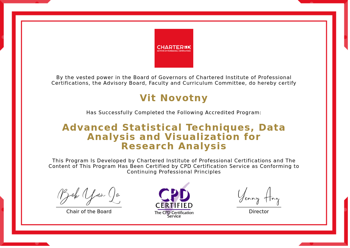 The certificate above verifies that Vit Novotny successfully completed the accredited program: Advanced Statistical Techniques, Data Analysis and Visualization for Research Analysis.