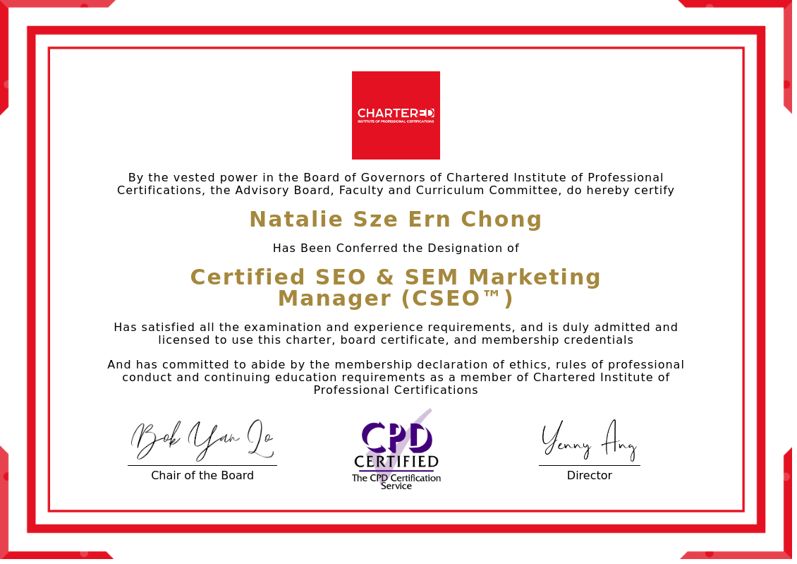 The certificate above verifies that Natalie Sze Ern Chong successfully satisfied all the exam and experience requirements and is duly admitted and licensed to use this Charter Certified SEO & SEM Marketing Manager (CSEO™), board certificate.