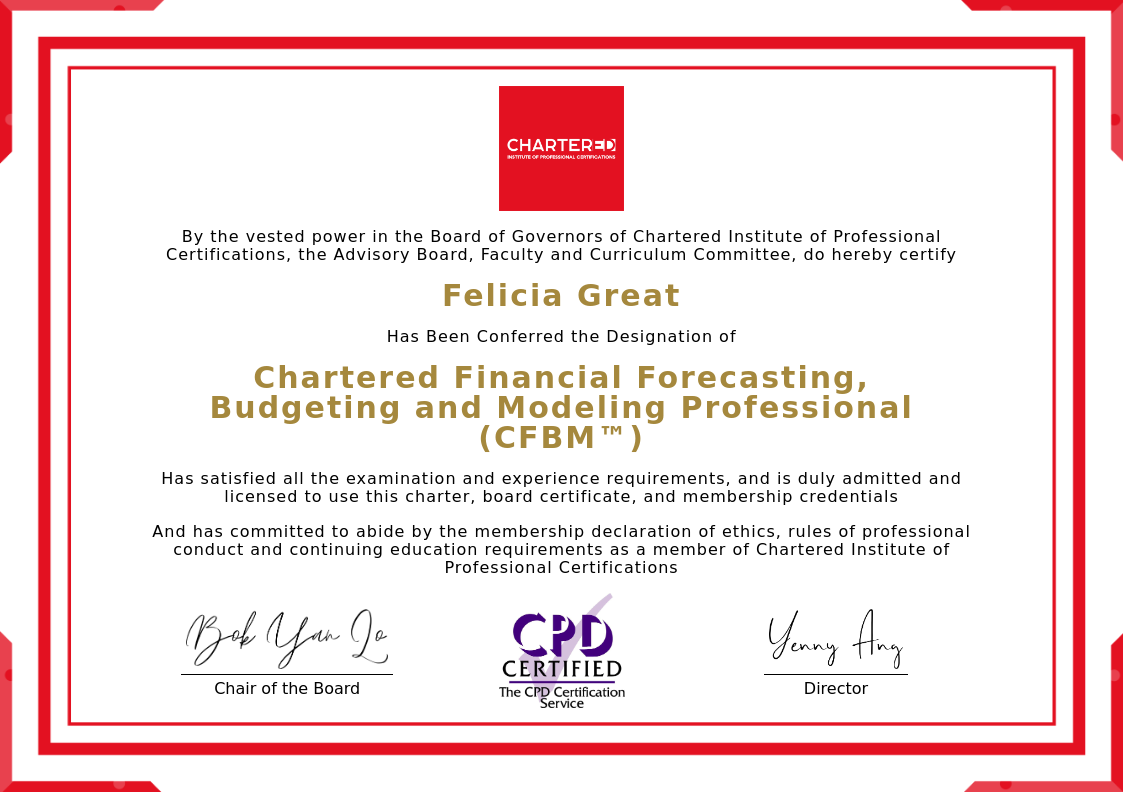 The certificate above verifies that Felicia Great successfully satisfied all the exam and experience requirements and is duly admitted and licensed to use this Charter Chartered Financial Forecasting, Budgeting and Modeling Professional (CFBM™), board certificate.