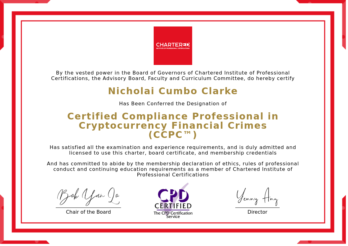 The certificate above verifies that Nicholai Cumbo Clarke successfully satisfied all the exam and experience requirements and is duly admitted and licensed to use this Charter Certified Compliance Professional in Cryptocurrency Financial Crimes (CCPC™), board certificate.