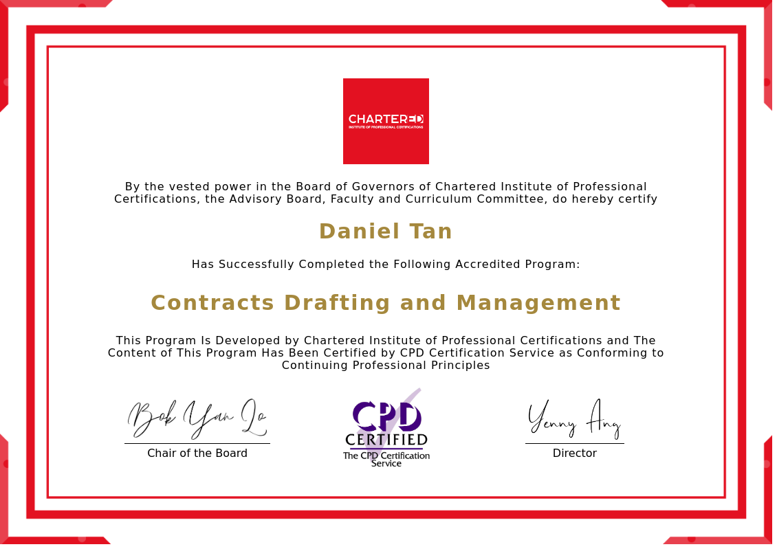 The certificate above verifies that Daniel Tan successfully completed the accredited program: Drafting Key Commercial Contracts and Reviewing Crucial Terms and Conditions For Non-Lawyers.
