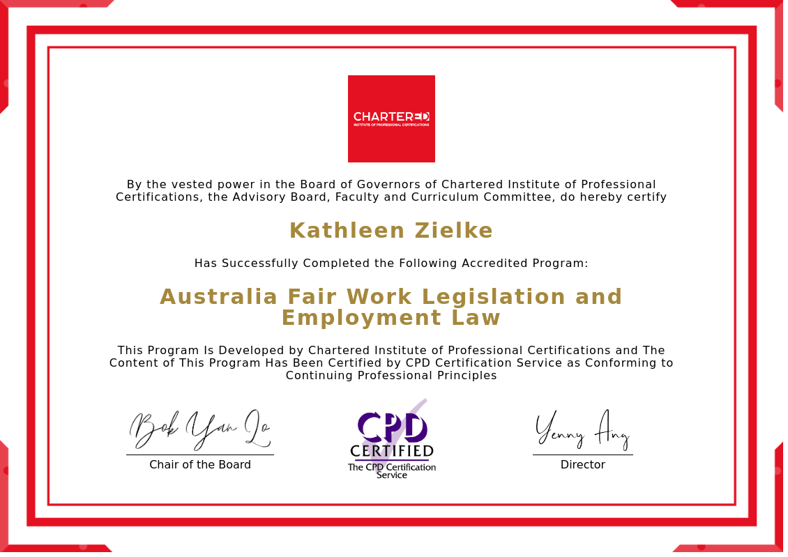 The certificate above verifies that Kathleen Zielke successfully completed the accredited program: 2026 Australia Fair Work Legislation and Employment Law.
