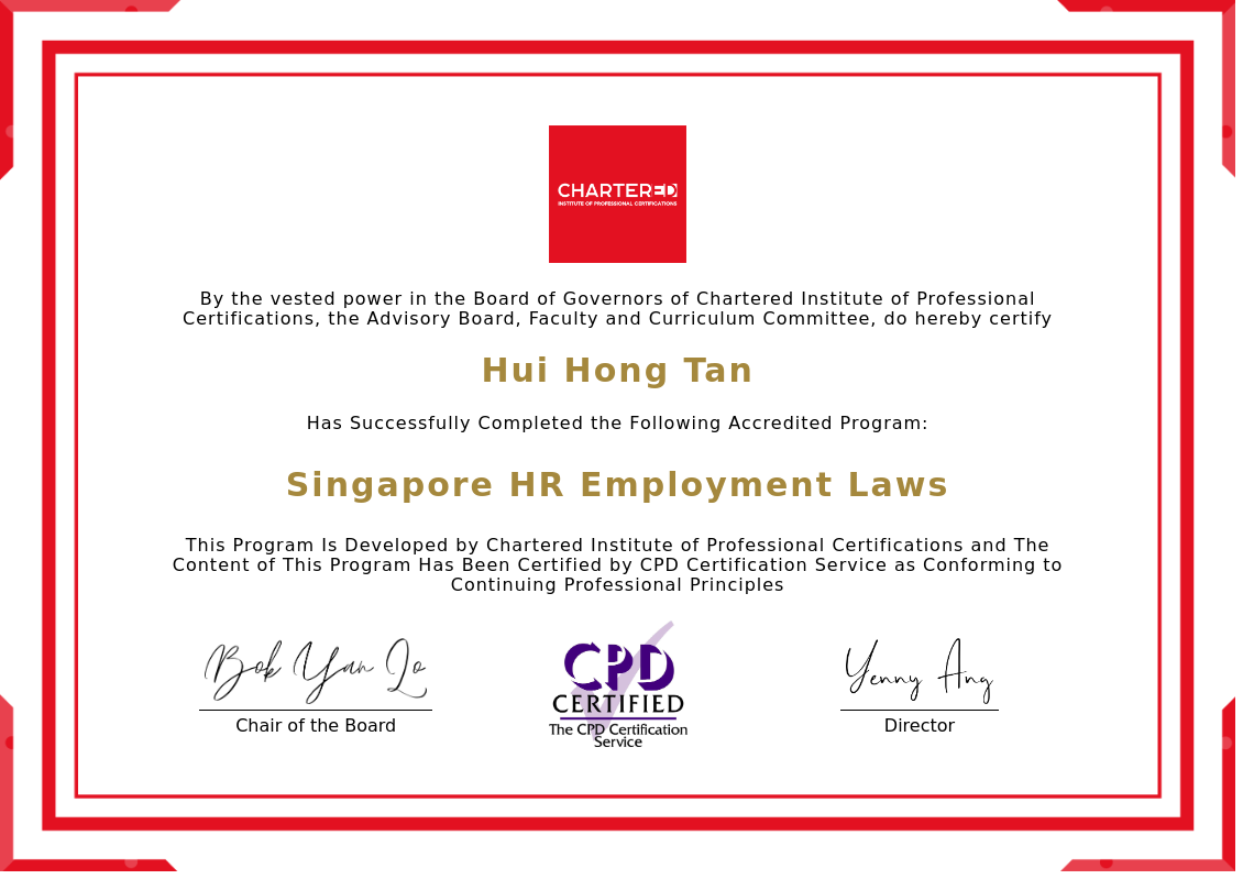 The certificate above verifies that Hui Hong Tan successfully completed the accredited program: 2024 Singapore HR Employment Laws.