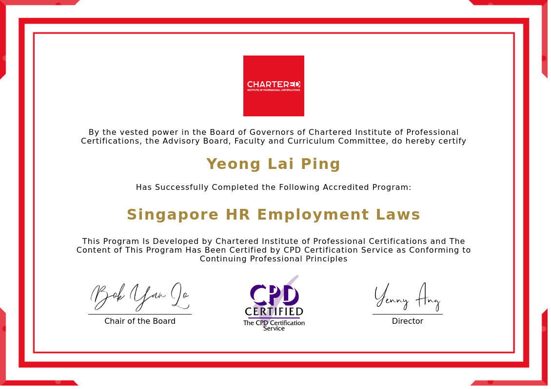The certificate above verifies that Yeong Lai Ping successfully completed the accredited program: 2024 Singapore HR Employment Laws.