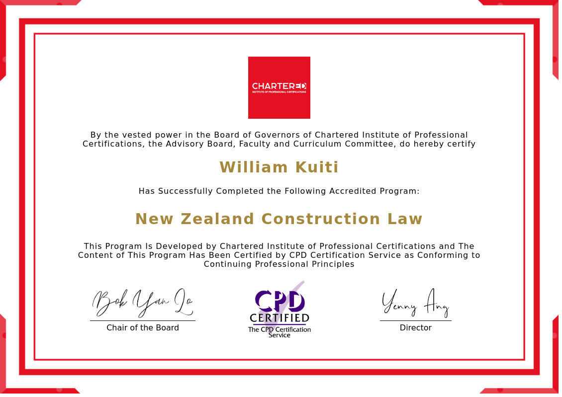 The certificate above verifies that William Kuiti successfully completed the accredited program: New Zealand Construction Law.