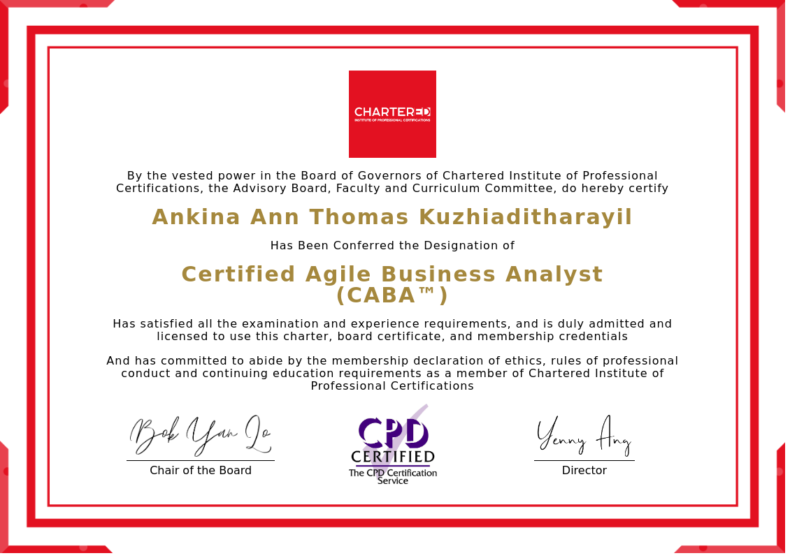 The certificate above verifies that Ankina Ann Thomas Kuzhiaditharayil successfully satisfied all the exam and experience requirements and is duly admitted and licensed to use this Charter Certified Agile Business Analyst (CABA™), board certificate.