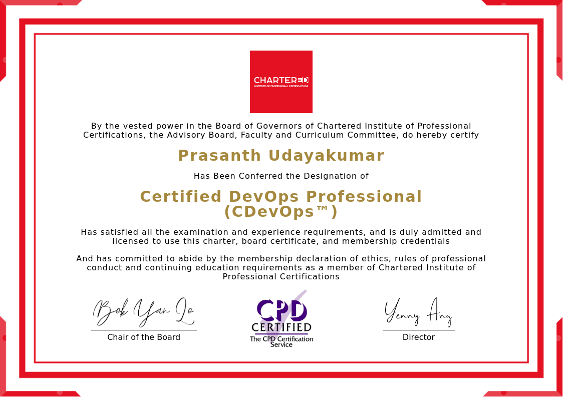 The certificate above verifies that Prasanth Udayakumar successfully satisfied all the exam and experience requirements and is duly admitted and licensed to use this Charter Certified DevOps Professional (CDevOps™), board certificate.