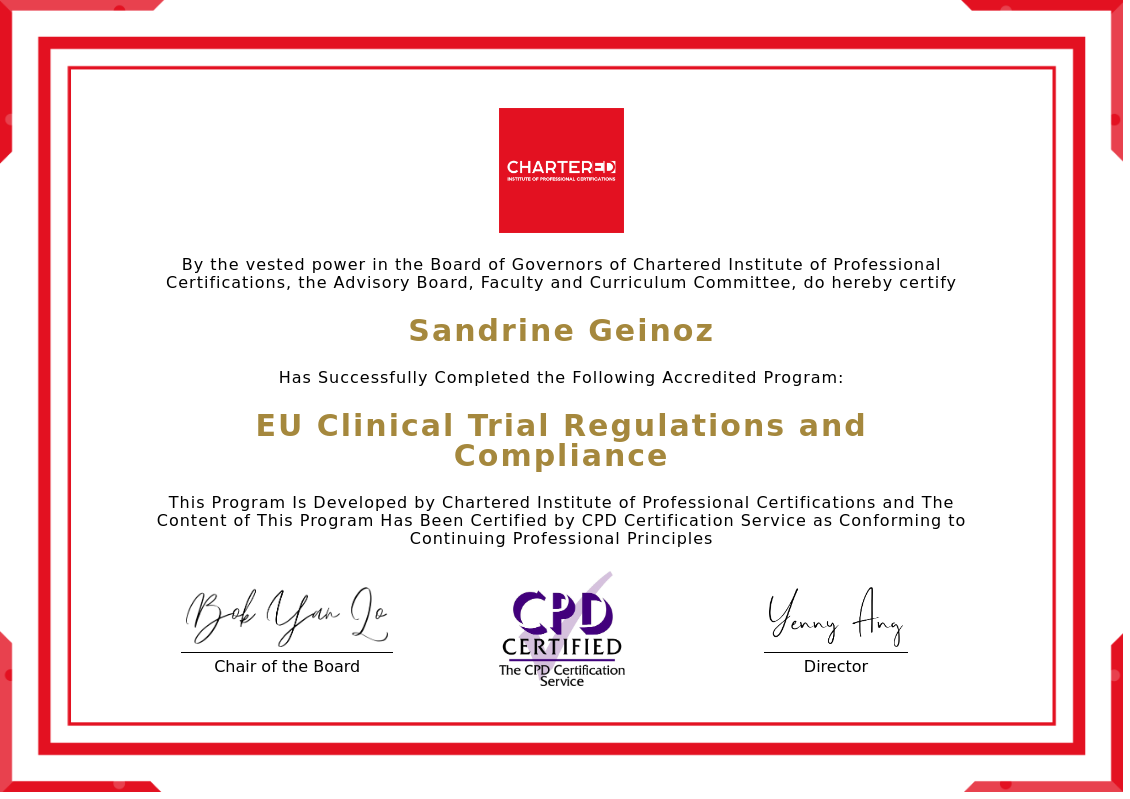 The certificate above verifies that Sandrine Geinoz successfully completed the accredited program: EU Clinical Trial Regulations and Compliance.