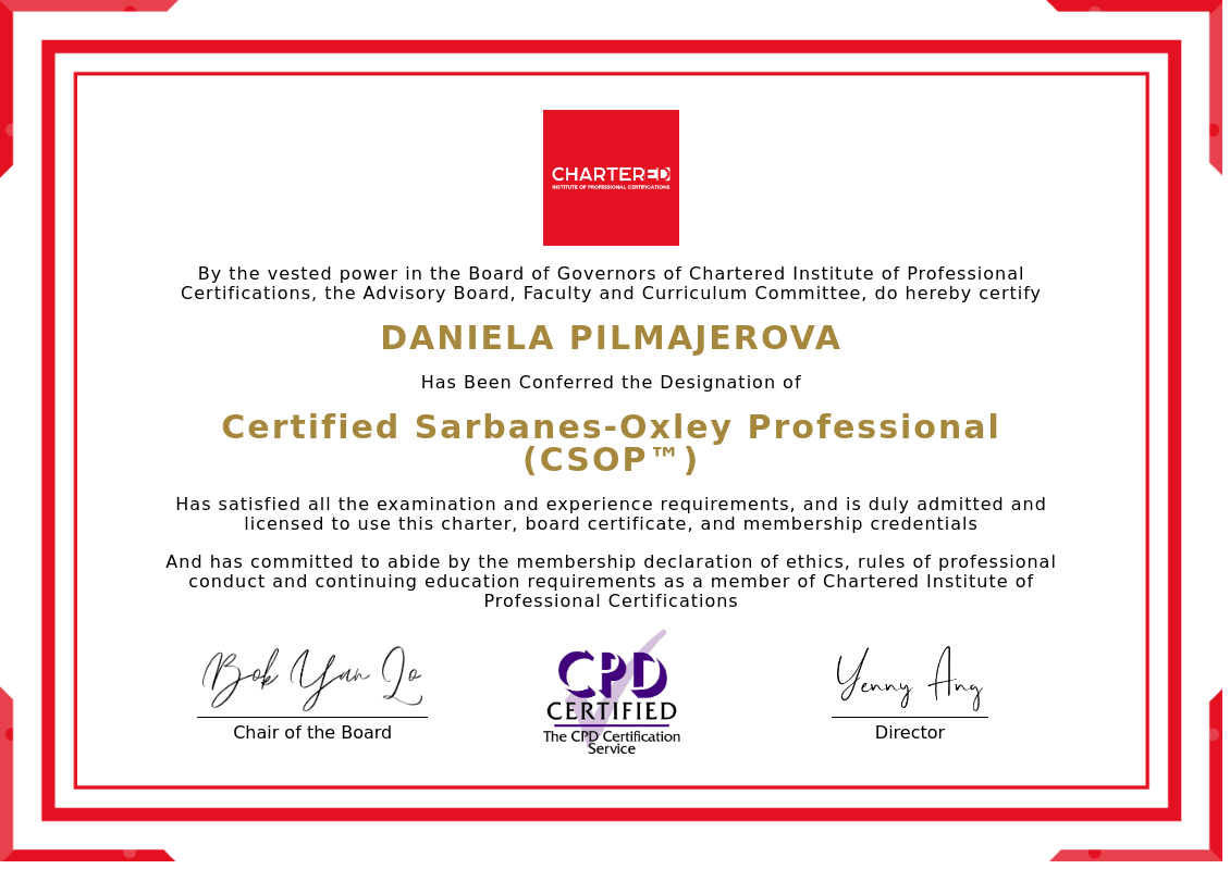 The certificate above verifies that DANIELA PILMAJEROVA successfully satisfied all the exam and experience requirements and is duly admitted and licensed to use this Charter Certified Sarbanes-Oxley Professional (CSOP™), board certificate.