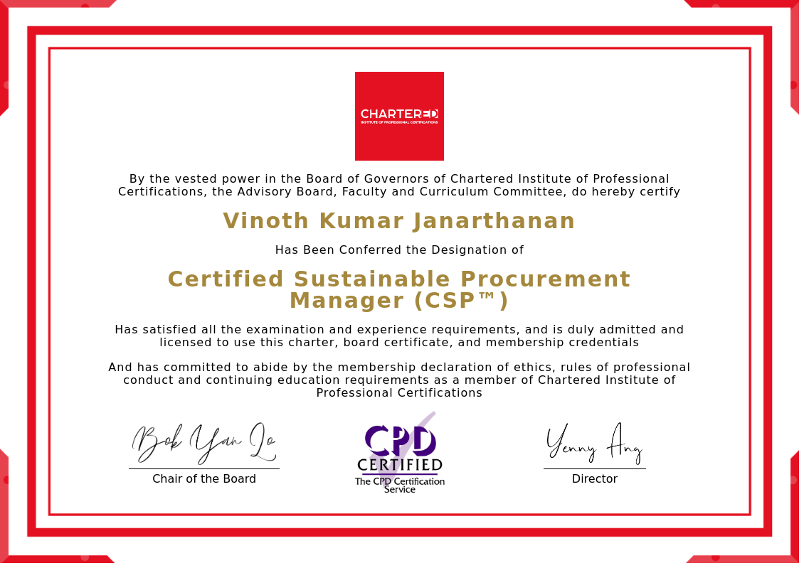 The certificate above verifies that Vinoth Kumar Janarthanan successfully satisfied all the exam and experience requirements and is duly admitted and licensed to use this Charter Certified Sustainable Procurement Manager (CSP™), board certificate.