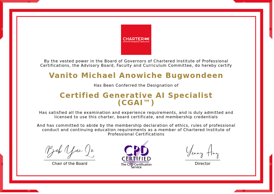 The certificate above verifies that Vanito Michael Anowiche Bugwondeen successfully satisfied all the exam and experience requirements and is duly admitted and licensed to use this Charter Certified Generative AI Specialist (CGAI™), board certificate.