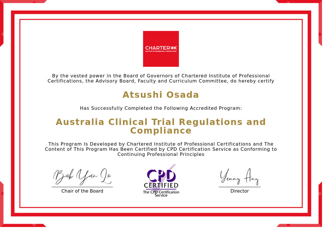 The certificate above verifies that Atsushi Osada successfully completed the accredited program: Australia Clinical Trial TGA Regulations and GCP Compliance.
