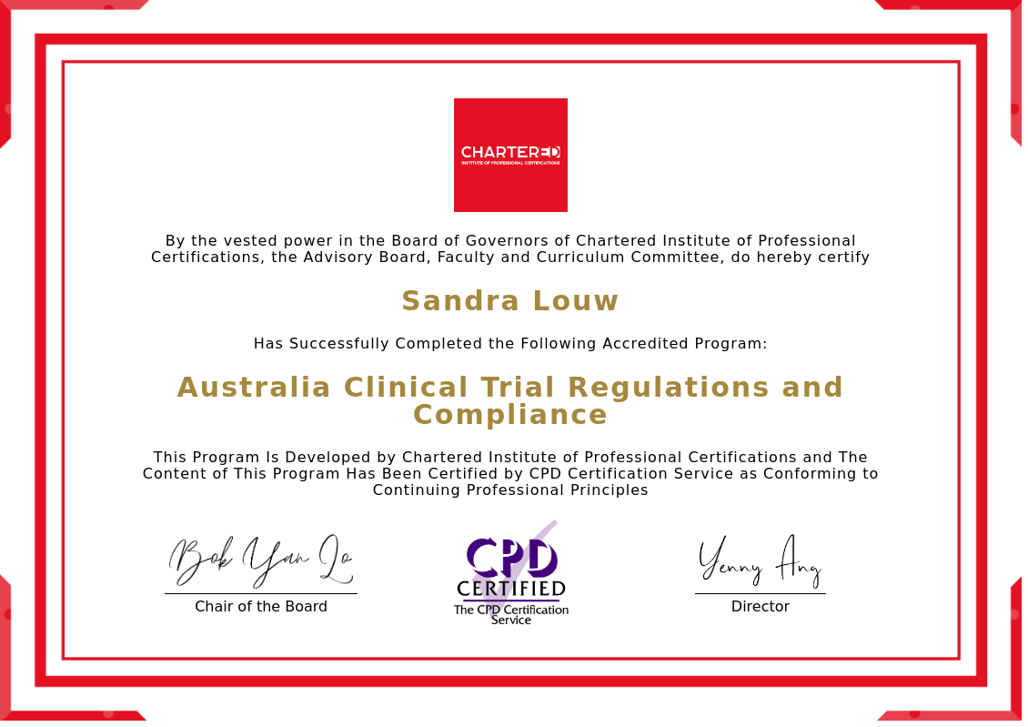 The certificate above verifies that Sandra Louw successfully completed the accredited program: Australia Clinical Trial TGA Regulations and GCP Compliance.