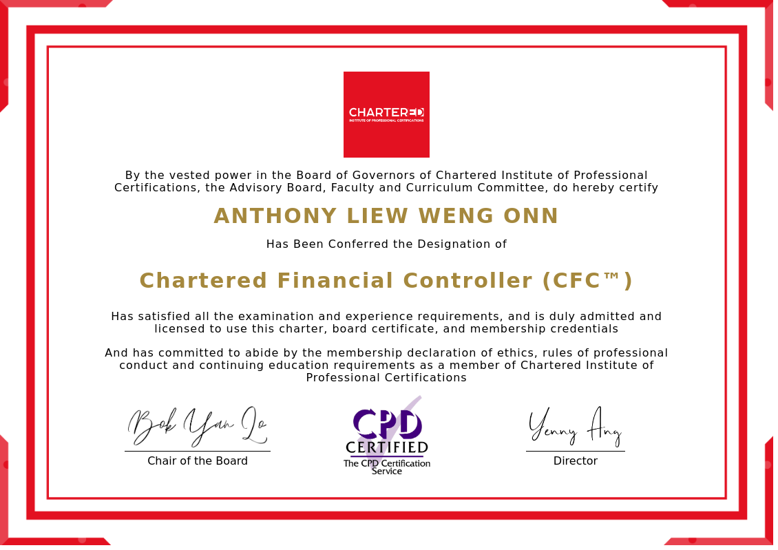 The certificate above verifies that ANTHONY LIEW WENG ONN successfully satisfied all the exam and experience requirements and is duly admitted and licensed to use this Charter Chartered Financial Controller (CFC™), board certificate.