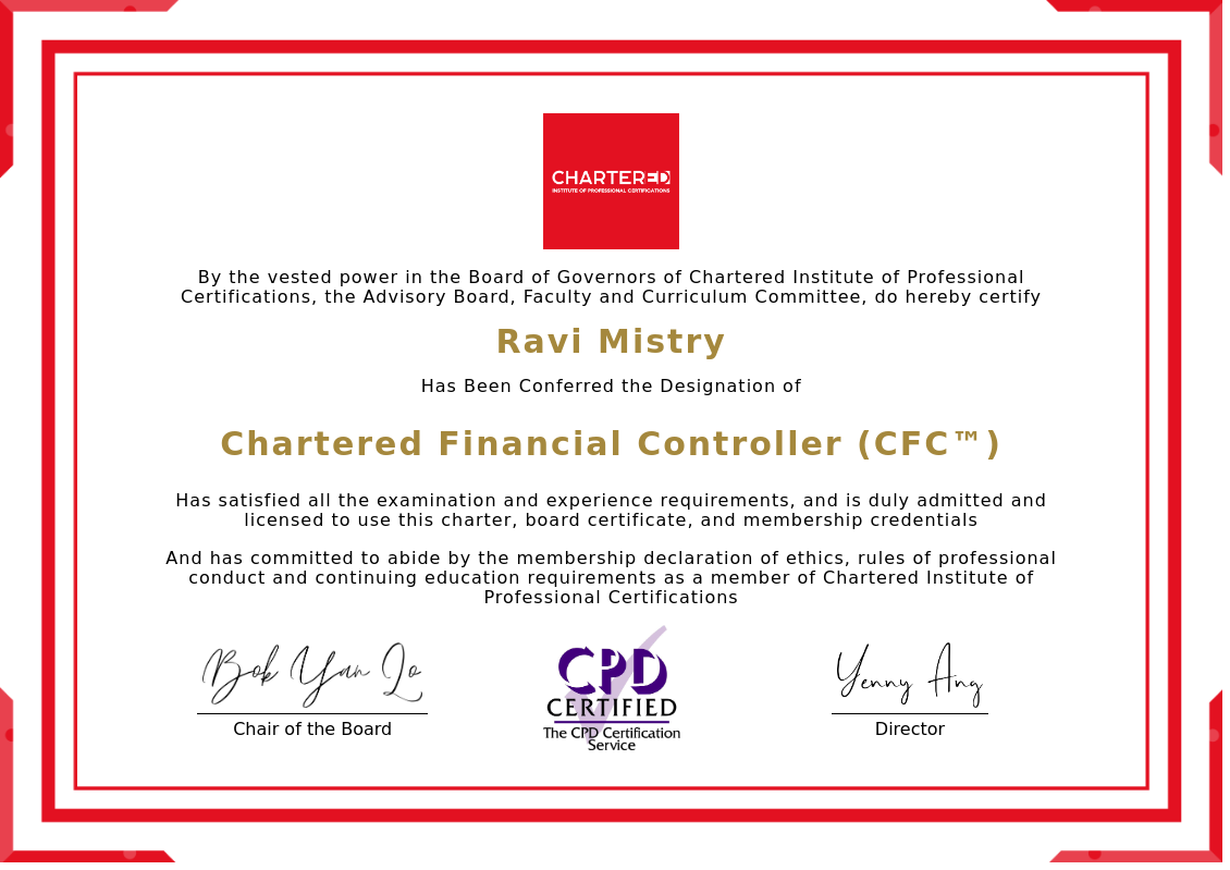 The certificate above verifies that Ravi Mistry successfully satisfied all the exam and experience requirements and is duly admitted and licensed to use this Charter Chartered Financial Controller (CFC™), board certificate.