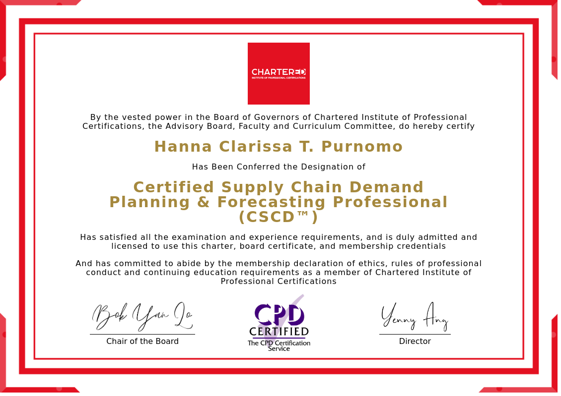 The certificate above verifies that Hanna Clarissa T. Purnomo successfully satisfied all the exam and experience requirements and is duly admitted and licensed to use this Charter Certified Supply Chain Demand Planning & Forecasting Professional (CSCD™), board certificate.